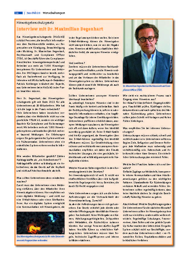 Geschäftsführer Dr. Maximilian Degenhart wurde für die Ausgabe Januar/Februar 2026 des Wirtschaftsreports der IHK Siegen als Experte zum Hinweisgeberschutzgesetz (HinSchG) interviewt.